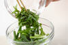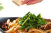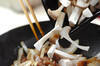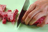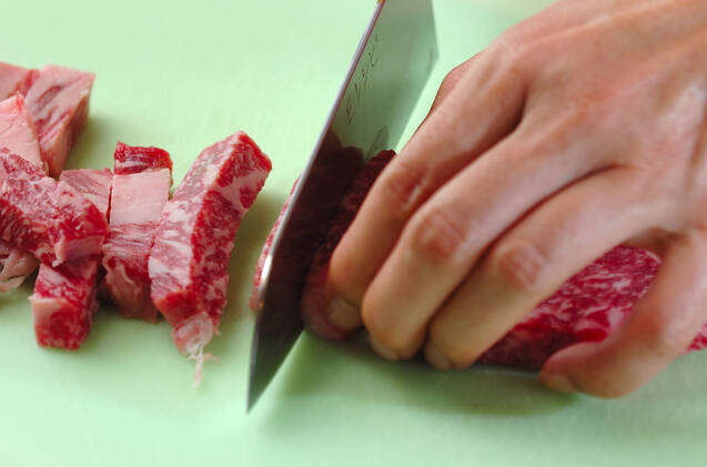 牛肉は幅1cmの棒状に切って塩を振る。エリンギは牛肉位の大きさの縦切りにする。玉ネギは縦に幅1cmに切る。