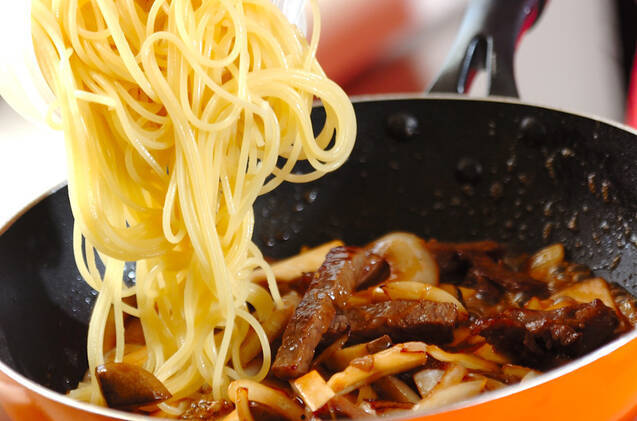 スパゲティーがゆで上がったら、レンジ用パスタゆで容器の蓋をしてお湯を捨てる。4のフライパンにバター、<調味料>の材料を加え、味をからませるように強火で炒め合わせる。全体に炒められたらスパゲティーを加え、さらに炒め合わせる。