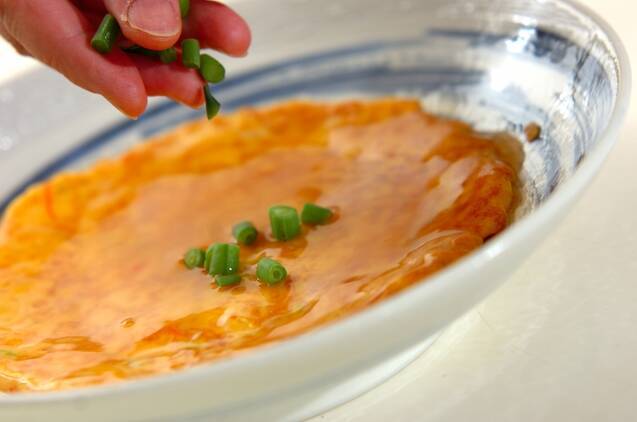 ひっくり返して薄く焼き色をつけ、器にのせる。<甘酢あん>をかけ、サヤインゲンを散らす。
