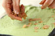 5の<抹茶チョコクリーム>を<ロール生地>にぬり広げ、生八つ橋を全体に散らし、巻く。残しておいた<抹茶チョコクリーム>を下部分にぬり、細かく砕いた八つ橋をくっつけて完成。