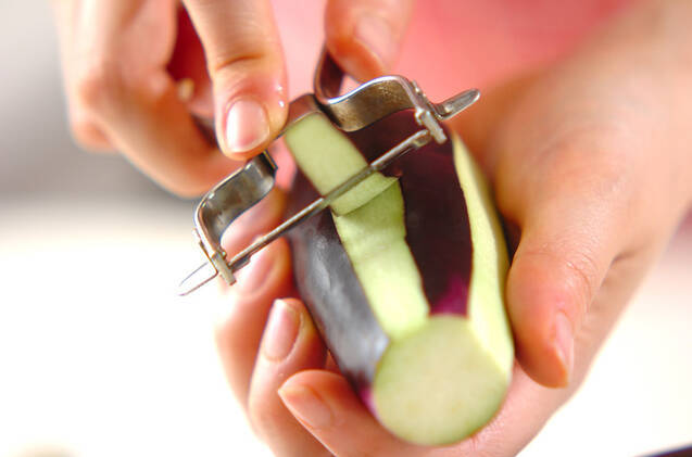 ナスはヘタを切り落とし、皮を縦じまにピーラーでむく。縦4等分に切って斜め切りにし、分量外の塩水に放つ。