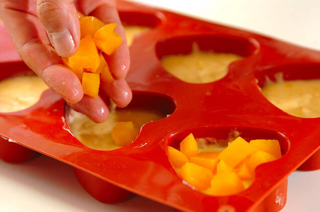 型に8分目まで流し入れ、角切りの黄桃をのせ、180℃に予熱しておいたオーブンで18~20分焼く。