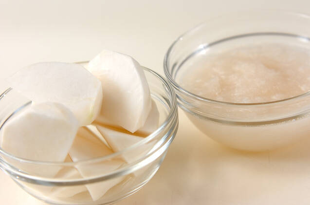 カブの葉を切り落とし、皮をむいて1個は8~12個のくし切りにする。1個はすりおろす。里芋、レンコンは皮をむいて1cm角に切る。ショウガは皮をむいて薄切りにする。甘塩タラ切り身は食べやすい大きさに切って片栗粉をからめる。