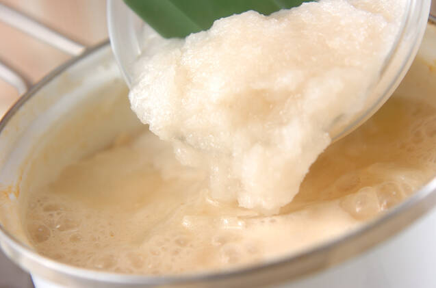 カブ、里芋、レンコンを加え、柔らかくなるまで7~8分アクを取りながら煮る。2のタラを戻し入れさらに2~3分煮て塩コショウで味を調え、最後にすりおろしたカブを加えてひと煮立ちさせる。器に注ぎ入れ、ドライパセリを振る。