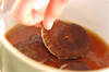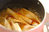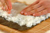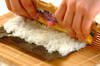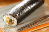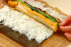 <卵焼き>を作る。卵焼き器を中火にかけて薄くサラダ油をひき、卵液の1/3量を入れて半熟になったら卵を向こう側に寄せる。空いた所にサラダ油をひき、残りの卵液の半量を流し入れ、寄せた卵の下にも卵液を流し、手前に巻く。同様にもう一度巻く。巻きすに巻いて形を整え、冷めたら食べやすい大きさの棒状に切る。