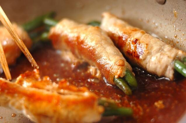 酒、みりん、しょうゆを入れて、汁気がなくなるまで中火の弱火で5分程煮る。途中でひっくり返しながら全体に味がしみこむように焼く。