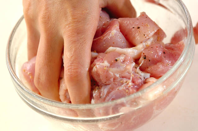 鶏もも肉はひとくち大の削ぎ切りにし、<下味>の材料をしっかりもみ込む。
