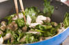 菊菜は水洗いし、根元の固い部分を切り落とし、3cmの長さに切る。牛薄切り肉は3cm幅に切り、<下味>をもみこむ。シメジは石づきを切り落とし、小房に分ける。