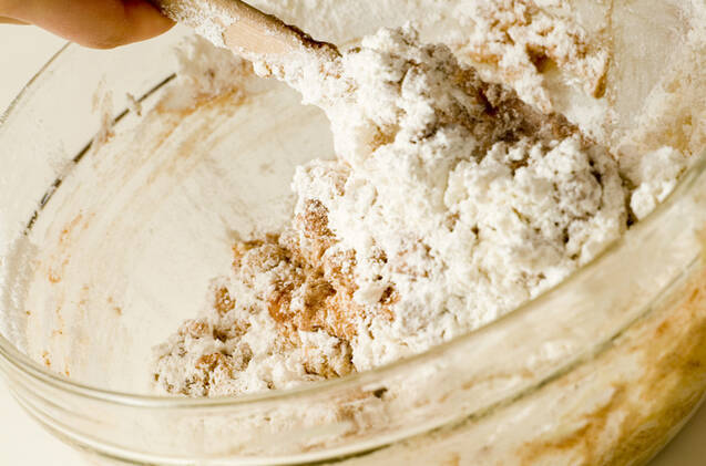 3に薄力粉とベーキングパウダーをふるいながら入れ、練らないようにサックリ混ぜる。