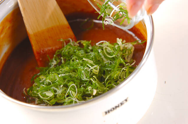 <みそソース>を作る。鍋に材料を入れてよく混ぜ合わせ、中火にかける。混ぜながら煮立ったら火を止め、粗熱が取れたら刻みネギを加えてよく混ぜ合わせる。(固くなってしまったら、だし汁でのばす)