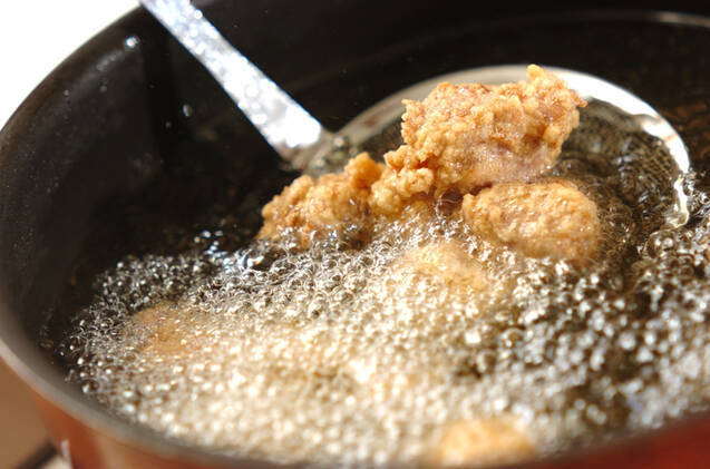 豚ロース肉に片栗粉をまぶし、160℃の揚げ油でゆっくりカリッと揚げ、油をきる。