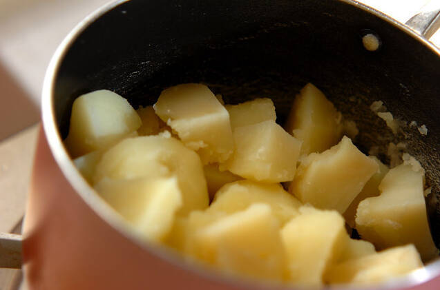 <マッシュポテト>のジャガイモとかぶるくらいの水を鍋に入れて柔らかめにゆでる。お湯を捨てて火にかけ、水分を飛ばす。