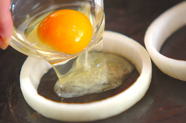フライパンにサラダ油を薄く敷いて玉ネギを入れ、中央に卵を割り入れお好みの焼き加減の目玉焼きにする。ベーコンは両面焼き色がつくまで焼く。レタスは食べやすい大きさにちぎって水に放ち、パリッとしたら水気をきる。レタスはキッチンペーパーにのせ余分な水分をきる。