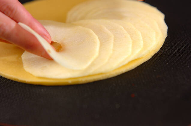 2の上にリンゴをずらしながら1周並べる。上に澄まし無塩発酵バターを塗り、バニラシュガーをたっぷり振り掛ける。185℃に予熱しておいたオーブンで50~60分程焼く。※澄ましバターとはバターを湯せんにかけて溶かして得られる、上澄みのことを指します。※バニラシュガーがない場合は、グラニュー糖にバニラビーンズの粒を混ぜ合わせ、フードプロセッサーで撹拌してもOKです。※ここではガスオーブンを使用しています。オーブンにより、温度差や焼き時間には違いがあるので、ふだんからお家のオーブンの癖を知っておくことをおすすめします。目安として小型の電気オーブンの場合、レシピより10~20℃高い設定にして下さい。