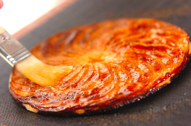 焼き上がったら表面に温めたアプリコットナパージュを塗り、周りに粉糖を振り掛ける。