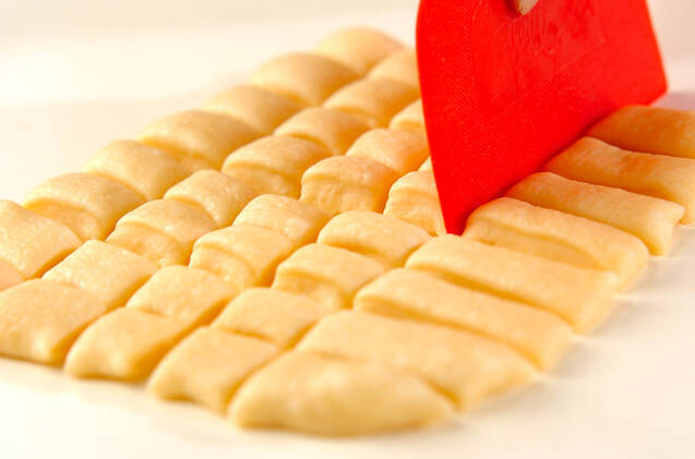 成形する。とじ目を下にして、幅20cmの正方形に広げ、さらに横8等分、縦6等分にカードで切り込みを入れていく。