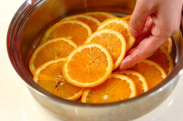 <バターシロップ&トッピング>を作る。オレンジは分量外の塩少々でこすり洗いし、水で流す。幅2~3mmの輪切りにし、<バターシロップ&トッピング>のグラニュー糖、水と共に鍋、またはフライパンに入れる。