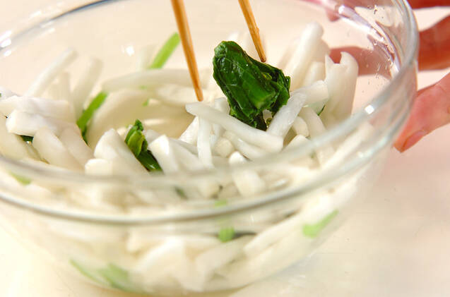 カブ、カブの葉を合わせ塩で軽くもみ、しんなりしたら水気を絞る。<合わせ酢>の材料をからめて器に盛り、ユズ皮をのせる。