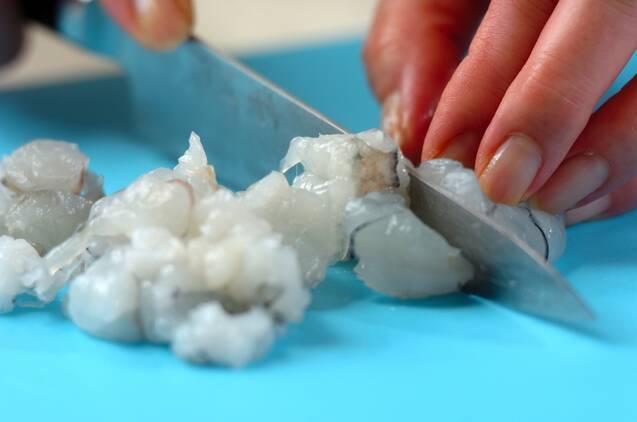 エビは殻と背ワタを取り、分量外の塩、片栗粉を順にもみ込んで水洗いして水気を拭き取り、半量をザク切りにする。
