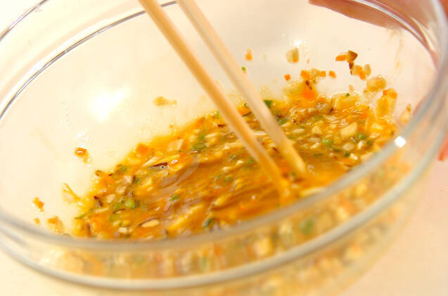 ボウルに卵を割り入れ、泡立てないように溶きほぐし、<調味料>の材料を加えて混ぜる。シイタケ、ニンジン、刻みネギ、チリメンジャコを加えて混ぜる。