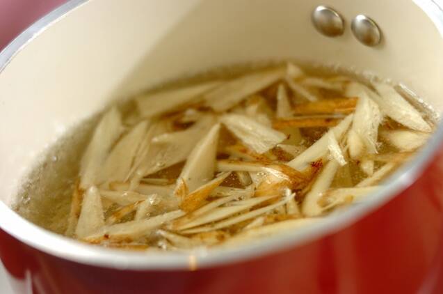 鍋に湯を沸かし、ゴボウを入れて30秒ゆでてザルに上げ、粗熱を取る。