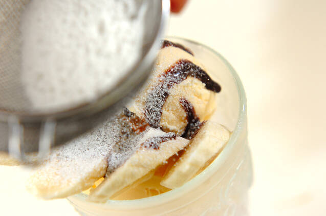 器にバナナ、バニラアイス、クッキーを盛り合わせ、チョコシロップ、粉糖をかけ、ミントの葉を飾る。