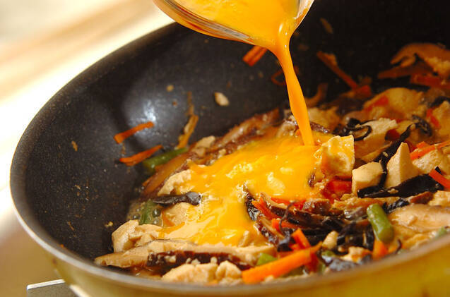 最後に卵を加え、全体にからめるように炒め合わせる。器に盛り分け、刻みネギをのせる。