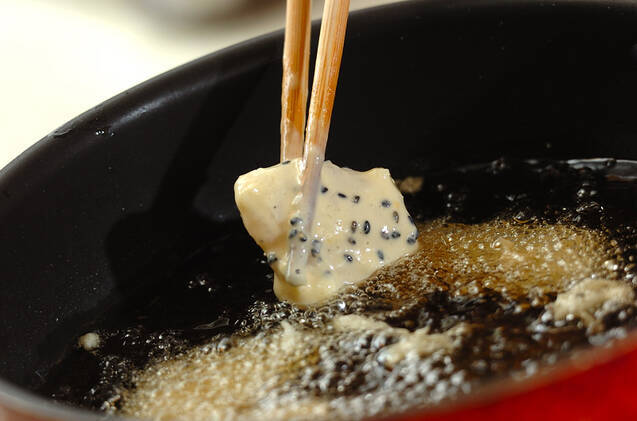 白身魚は3cm位の削ぎ切りにし、混ぜ合わせた<天ぷらの衣>をつけ、170℃に熱した油で揚げる。(ヒント)天ぷらの衣は小麦粉の代わりに天ぷら粉を使ってもいいです。