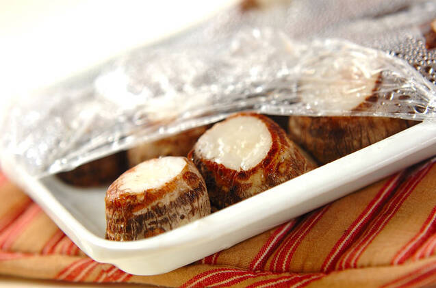 里芋はきれいに水洗いして上下を切り落とし、もう一度水にくぐらせて耐熱容器に並べる。ふんわりラップをかけ、電子レンジで7~8分加熱する。竹串がスッと刺さったら、里芋が熱い間にぬれ布巾等で皮をむく。大きい場合は半分に切る。電子レンジは600Wを使用しています。