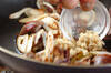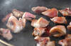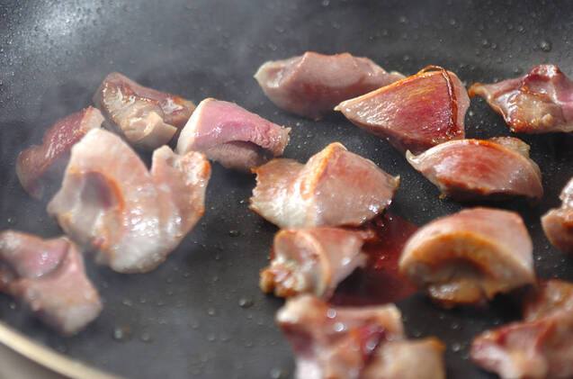 フライパンにサラダ油を強めの中火で熱し、砂肝を炒める。切り込みが開いてくるまで、しっかり炒める。