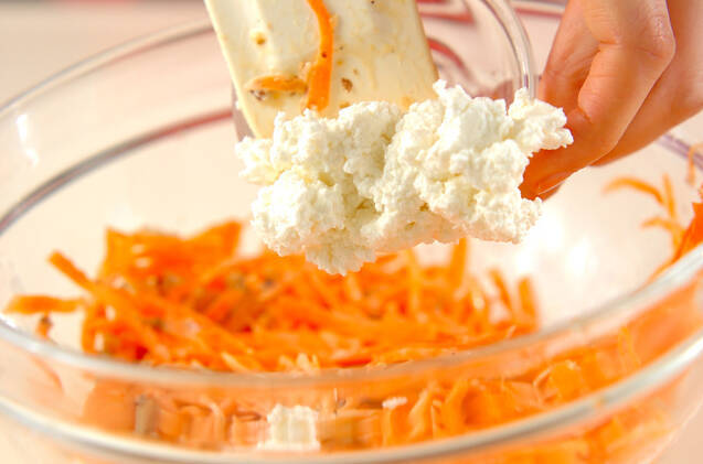 <調味料>のボウルにニンジン、クルミ、カッテージチーズを加えて混ぜる。器に盛り、イタリアンパセリを散らす。