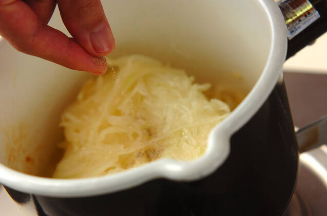 フライパンにバターを熱し、玉ネギを入れて塩コショウを振り、中火で炒める。鍋底が焦げてきたら、こそげ落とすようにして、弱めの中火で炒め続ける。