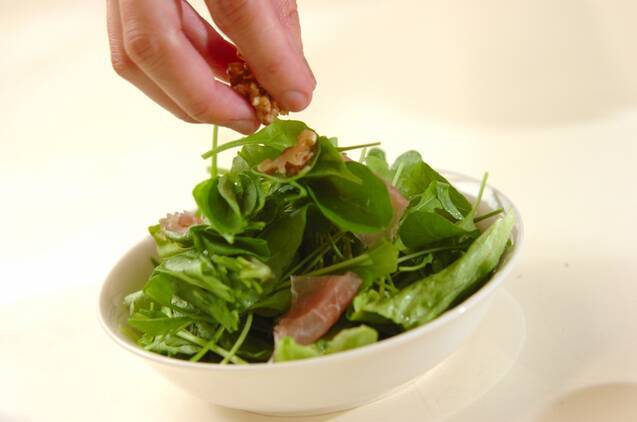 器にルッコラ、レタスを盛り、生ハムをのせてクルミをちらす。