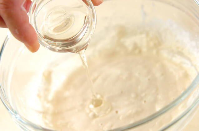 <衣>を作る。衣の粉類を合わせて振るい、その中に塩、水、サラダ油を加えて混ぜ合わせる。
