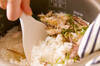 グリルの網にサラダ油を薄く塗り、アジの開きをのせて両面に焼き色がつけば取り出し、身をほぐす。