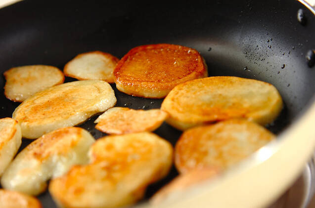 フライパンにオリーブ油を中火で熱し、ジャガイモを並べて両面焼き色がつくまで焼く。竹串を刺してスッと刺さったらOKです。