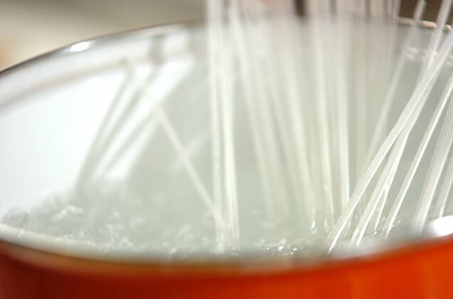 乾燥葛きりは、袋の指示通り柔らかくもどす。水煮葛きりの場合はザルに上げ、流水で洗って水気をきる。