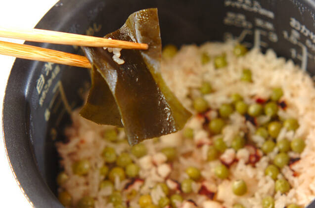 炊きあがったら、昆布を取り出して10分位蒸らし、しゃもじでご飯と炊飯器の間を1周し隙間を作り、底から持ち上げるようにふんわり混ぜ、器によそう。
