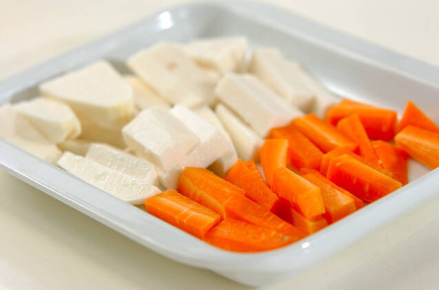 大和芋は皮をむいて長さを半分に切り、さらに幅1cmの棒状に切る。