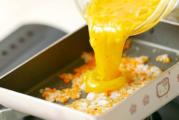 <厚焼き卵>を焼く。ボウルに卵を割り、ホタテ、塩コショウを混ぜ合わせ、卵焼き器にサラダ油を入れ玉ネギ、ニンジンを中火で炒め、しんなりすれば卵液を一気に加える。