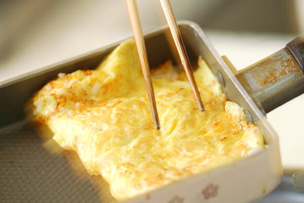 菜ばしで軽く混ぜ卵焼き器に広げ、固めの半熟になれば2つ折りにして両面に薄く焼き色がつくまで焼き冷ましておく。
