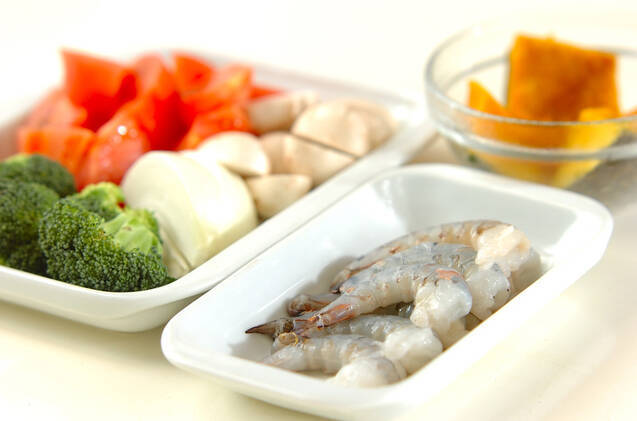 エビは殻と背ワタと取り除き、分量外の塩水で洗って水気を拭き取る。