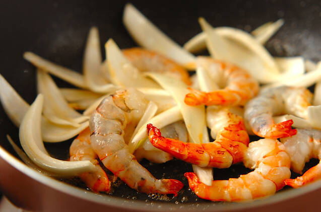 フライパンにバターを熱してエビと玉ネギを炒め、エビが赤くなったら小麦粉を全体に振り入れ、炒め合わせる。