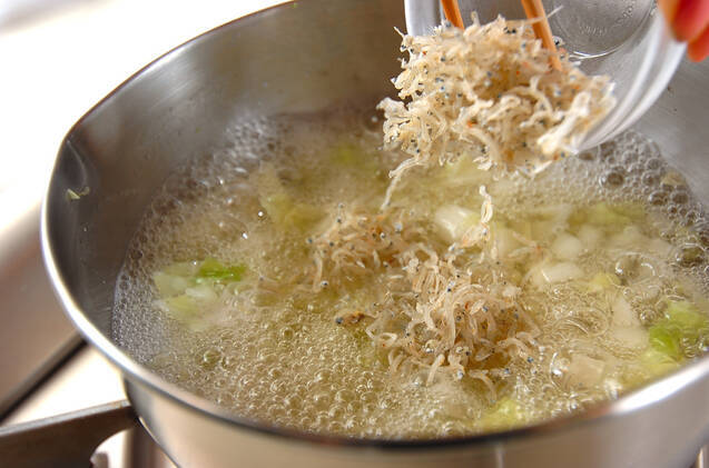 鍋にだし汁、里芋を入れて強火にかけ、煮立ってきたら白菜も加え、火を弱め里芋が柔らかくなるまで煮る。チリメンジャコと麦入りご飯を加えて菜ばしで軽くほぐし、<調味料>を加える。