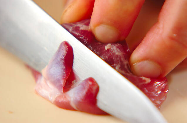 砂肝は白いかたい部分を削ぎ落とし、薄切りにして紹興酒を振る。