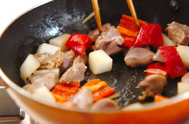 フライパンにゴマ油、ニンニクを入れて中火にかけ、香りがたってきたら、汁気をきった砂肝、大根を加え、強火で炒め合わせる。大根が少し透き通ってきたら、赤ピーマンを加えて炒める。