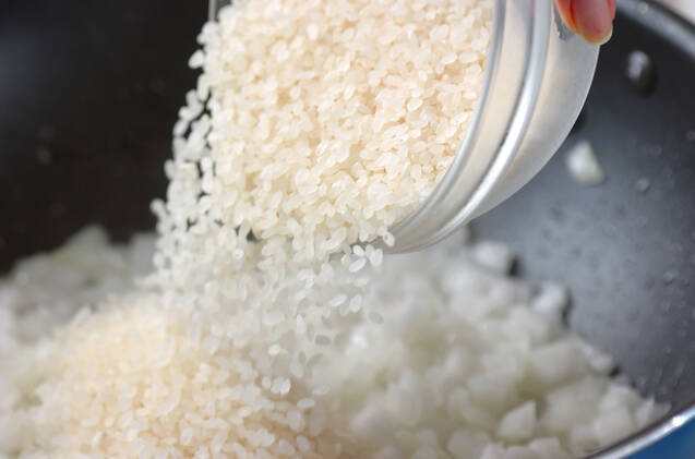 鍋にオリーブ油を強火で熱して玉ネギと大根を炒め、玉ネギが透き通ってきたらお米を加えて炒め合わせる。