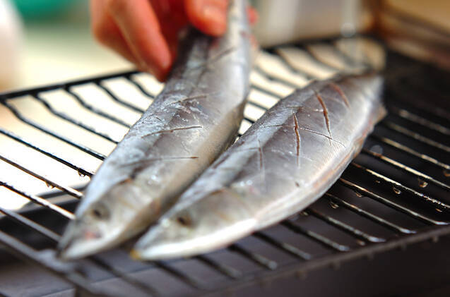 グリルの網にサラダ油を薄くぬって、サンマを盛りつける側を上にして並べ、中火くらいで7~8分焼く。表面が焦げるようならアルミホイルをかけてください。サンマを器にのせ、大根おろし、甘酢ショウガ、スダチを添え、お好みでしょうゆをかけてください。