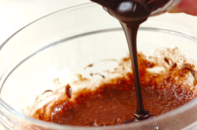溶きほぐした卵を(5)に少しずつ加えて混ぜ、さらに(4)を少しずつ加えて泡立て器で混ぜ合わせる。