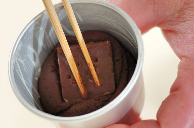 準備しておいたプリンカップに(7)を絞り入れ、(3)の<ガナッシュ>を埋め込むように入れ、<フォンダンショコラ生地>をかぶせるように表面を整える。180℃に予熱しておいたオーブンで約12~13分焼く。